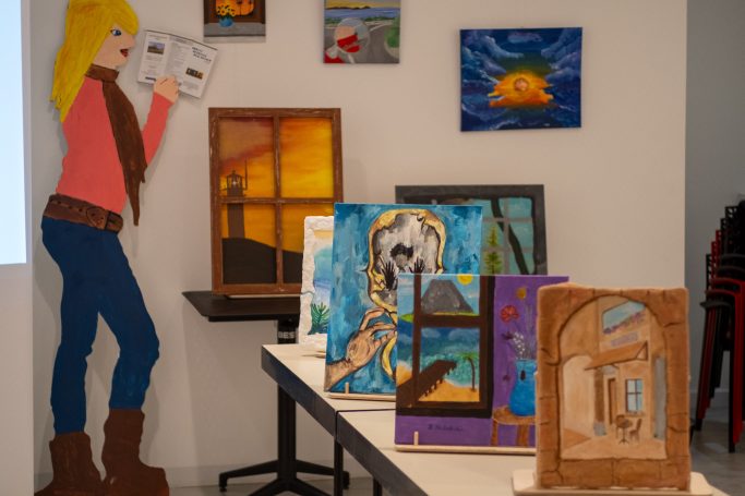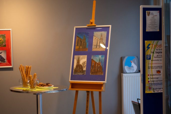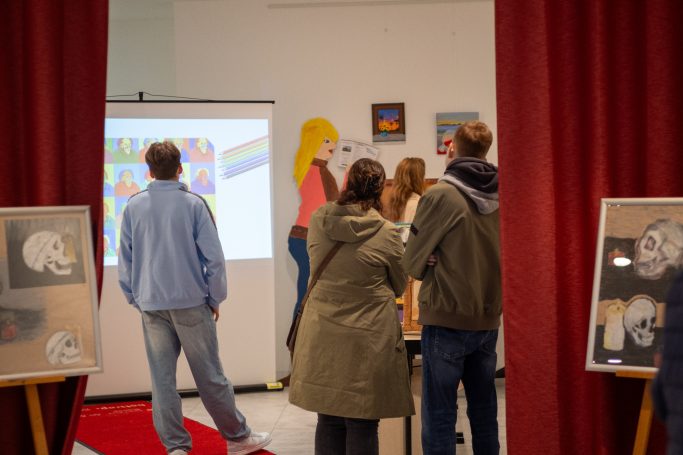 Am Donnerstagabend, den 26. September, fand schließlich die Finissage der Ausstellung statt, die einen gelungenen Abschluss dieser ersten „POP UP-Galerie“ im Quartiersbüro Innenstadt markierte. Viele Besucher:innen folgten der Einladung der Schule und bestaunten die Werke der jungen Künstlerinnen und Künstler. Auch ehemalige Schüler, deren Arbeiten ebenfalls Teil der Ausstellung waren, nahmen an der Veranstaltung teil. Schulleiter Rainer Pawliczek begrüßte die Gäste aus Politik, Kultur und Bürgerschaft (u.a. Bürgermeister Klaus Strehl, Sozialdezernentin Karen Alexius-Eifert) und zeigte sich stolz auf das, was die Schülerinnen und Schüler der AER mit ihrer ersten Ausstellung erreicht haben. Die Ausstellung wurde von Konrektorin Maria Freitag als Kuratorin begleitet, die sichtlich stolz einige einleitende Worte zur Ausstellung an die Besucher:innen richtete.