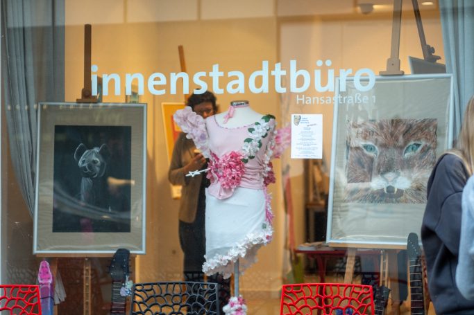 Im April dieses Jahres stand das Thema „Schule und Kunst“ auf der Agenda des Schulausschusses. Aus einem Fraktionsantrag entstand die Idee, Bottroper Schulen eine dauerhafte Plattform zur Verfügung zu stellen, um Kunstwerke, die im Rahmen des Kunst- und Textilunterrichts entstanden sind, der Öffentlichkeit zu präsentieren. Die Wirtschaftsförderung der Stadt Bottrop wurde damit beauftragt, geeignete Räumlichkeiten für dieses Vorhaben zu finden. Mit dem „Quartiersbüro Innenstadt“ auf der Hansastraße konnte ein idealer Ort gefunden werden, der fortan als Ausstellungsraum für die kreativen Arbeiten der Schulen dienen kann.