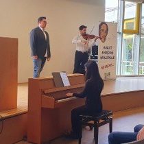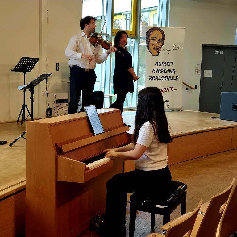 „Wisst ihr, welches Instrument ich hier in der Hand habe? Wer weiß denn etwas darüber?“. Gespannt schauten die SchülerInnen auf den Profimusiker, der in der Aula auf der Bühne der August-Everding-Realschule stand. Wieder einmal war Roman Brncic zu Gast und es hieß erneut „Musizieren statt konsumieren“. Ein klassisches Konzert mit Profimusikern, die sonst auf den großen Bühnen der Welt stehen, wer darf das als SchülerInn so mal erleben? Möglich macht dies die von Erich Fischer 1995 gegründete „Internationale Stiftung zur Förderung von Kultur und Zivilisation“ aus München. Das Stiftungsprojekt bietet SchülerInnen die Möglichkeit, klassische Musik direkt in den Schulen live und von professionellen MusikerInnen gespielt, zu erleben. Erste Unsicherheiten in den Gesichtern der SchülerInnen, weil es für viele neu war, wich gleich dem großen Staunen, das live zu hören. Es begann barock mit der „Air“ von Bach und dem „Ombra mai fu“ von Händel. Neben Roman Brncic (Violine) waren Ricardo Marinello (Gesang) und Maryana Brodska (Klavier) zu Gast und gaben dabei auch immer Einblicke in die Hintergründe und Inhalte der gespielten und gesungenen Stücke, und erklärten musikalische Fachbegriffe, wie z.B. was ein Kunstlied oder eine Oper ist. Die Pianistin Maryana Brodska war dabei nicht nur als Begleitung von Violine und Gesang dabei, sondern glänzte auch solistisch u.a.mit dem „Entertainer“ von Scott Joblin.