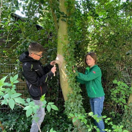 Kreativ ging es im Anschluss weiter: Im Rahmen des Kunstunterrichts gestalteten die SchülerInnen der Klasse 6c an Bäumen, Zäunen und Steinen ausdrucksstarke Gesichter. Im weitläufigen Garten der Schule entstanden so eindrucksvolle „Kunstwerke auf Zeit“.