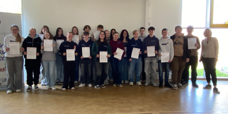 Umso größer ist die Freude in der gesamten Schulgemeinde darüber, dass in diesem Jahr erneut 14 Schülerinnen und Schüler der Jahrgangsstufe 9 erfolgreich zu Ersthelfenden im Schulsanitätsdienst ausgebildet werden konnten und nun ihren Dienst aufnehmen. Mit ihrem ehrenamtlichen Engagement leisten sie einen wertvollen Beitrag zu einem sicheren und gesundheitsbewussten Schulklima an der AER.