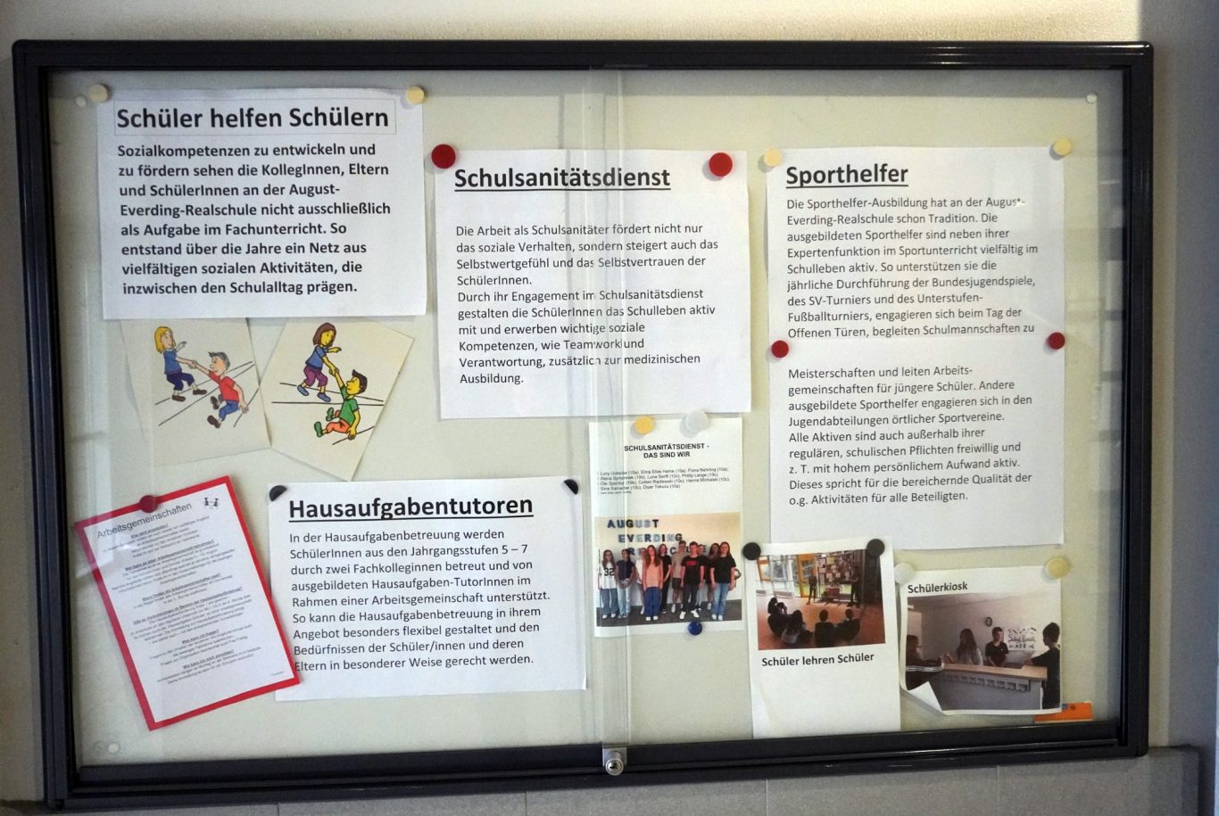 Die SH-Ausbildung unter der Leitung von Sportlehrer a. Schöps hat an der August-Everding-Realschule schon Tradition und die ausgebildeten Sporthelfer werden neben ihrer Expertenfunktion im Sportunterricht vielfältig im Schulleben eingesetzt. So unterstützen sie die jährliche Durchführung der Bundesjugendspiele, des SV-Turniers und des Unterstufen-Fußballturniers, engagieren sich beim Tag der offenen Tür, begleiten Schulmannschaften zu Meisterschaften und leiten AGs für jüngere Schüler. Andere ausgebildete Sporthelfer engagieren sich in den Jugendabteilungen örtlicher Sportvereine.